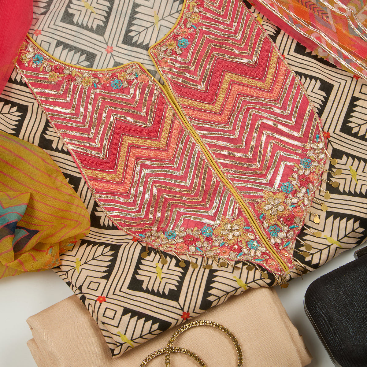 Exude understated elegance with this Beige Muslin Printed Suit, beautifully enhanced with Zardosi, Gota, and Sequin Embroidery on the yok. The ensemble is completed with a Chiffon Printed Dupatta featuring intricate Gota Lacchi Embroidery for a refined, festive finish.