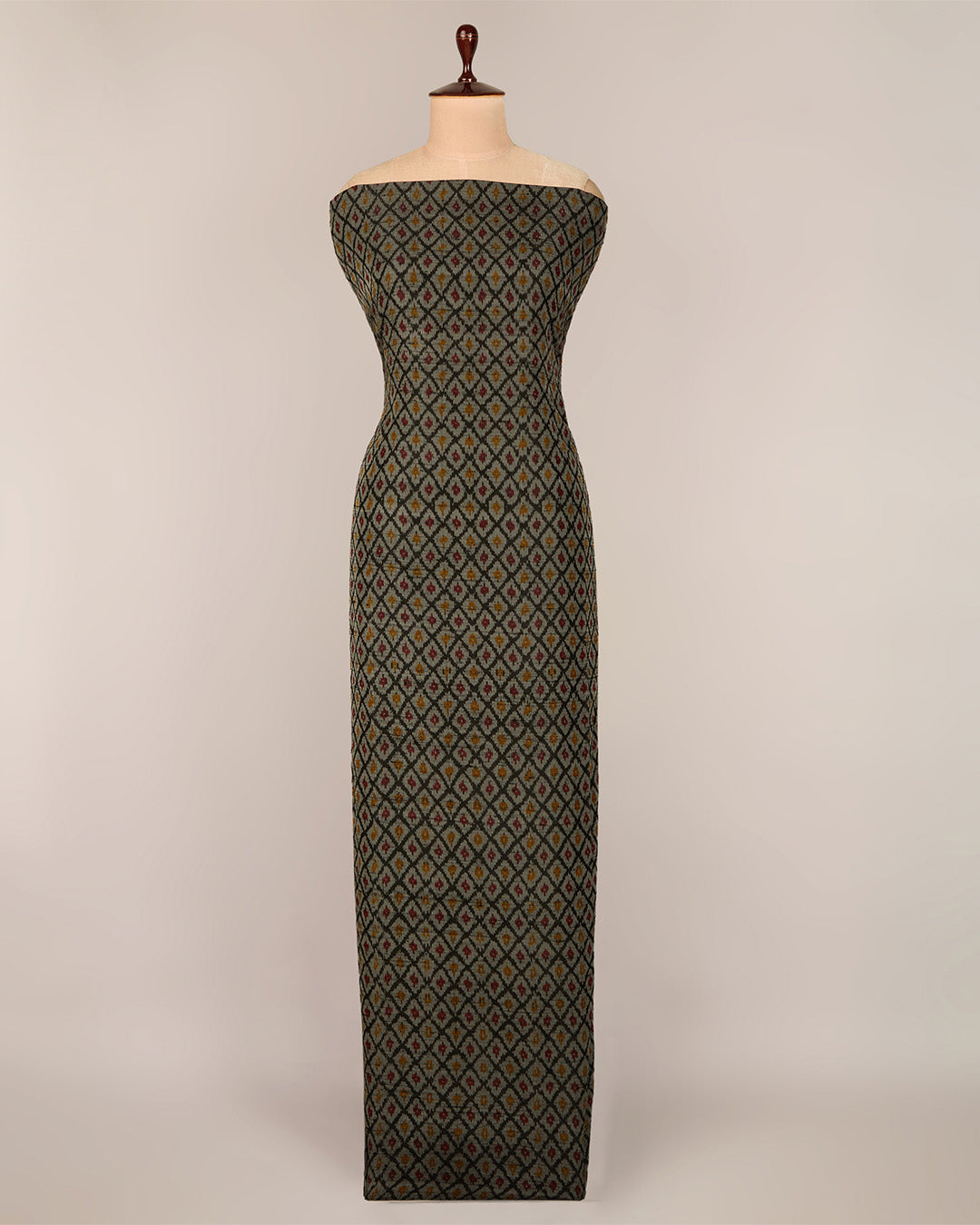 Discover the beauty of craftsmanship with this Black-Grey Raw Silk Ikat Fabric, handwoven with intricate patterns that reflect classic artistry. The natural sheen and textured finish of raw silk add depth and sophistication, making it an ideal choice for ethnic ensembles, jackets, saree blouses