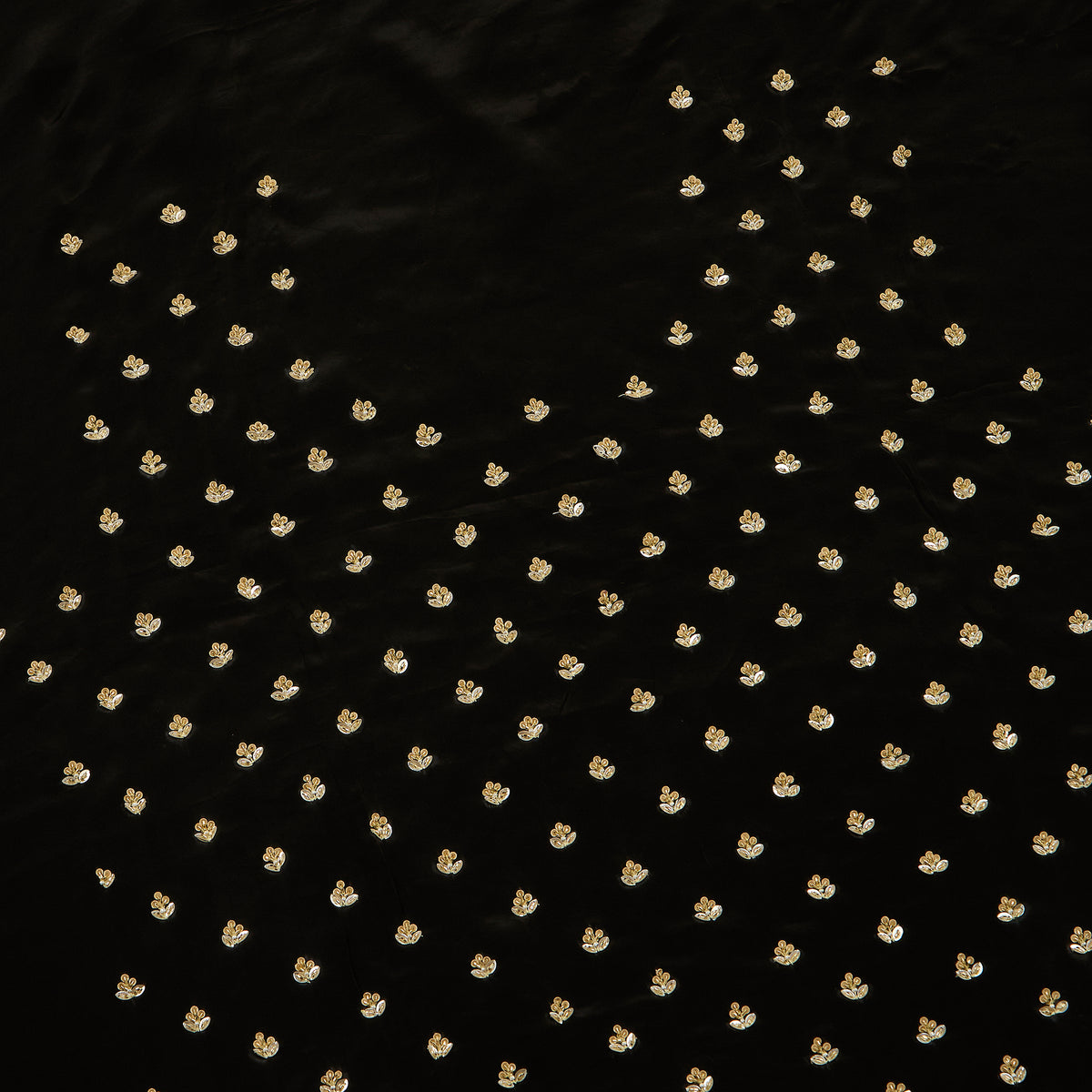 Chic black viscose crepe kurta adorned with sequin and cutdana embroidery on the daman and all over butti. Chinnon crepe dupatta and crepe bottom.