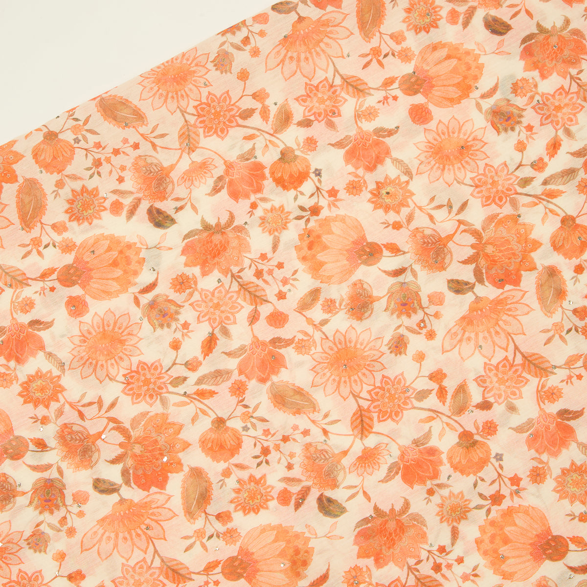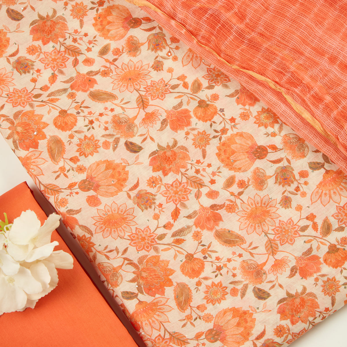 Enhance your festive look with this Coral Chanderi Printed Suit featuring subtle Badla highlights and a beautifully woven tie-dye Chanderi dupatta.