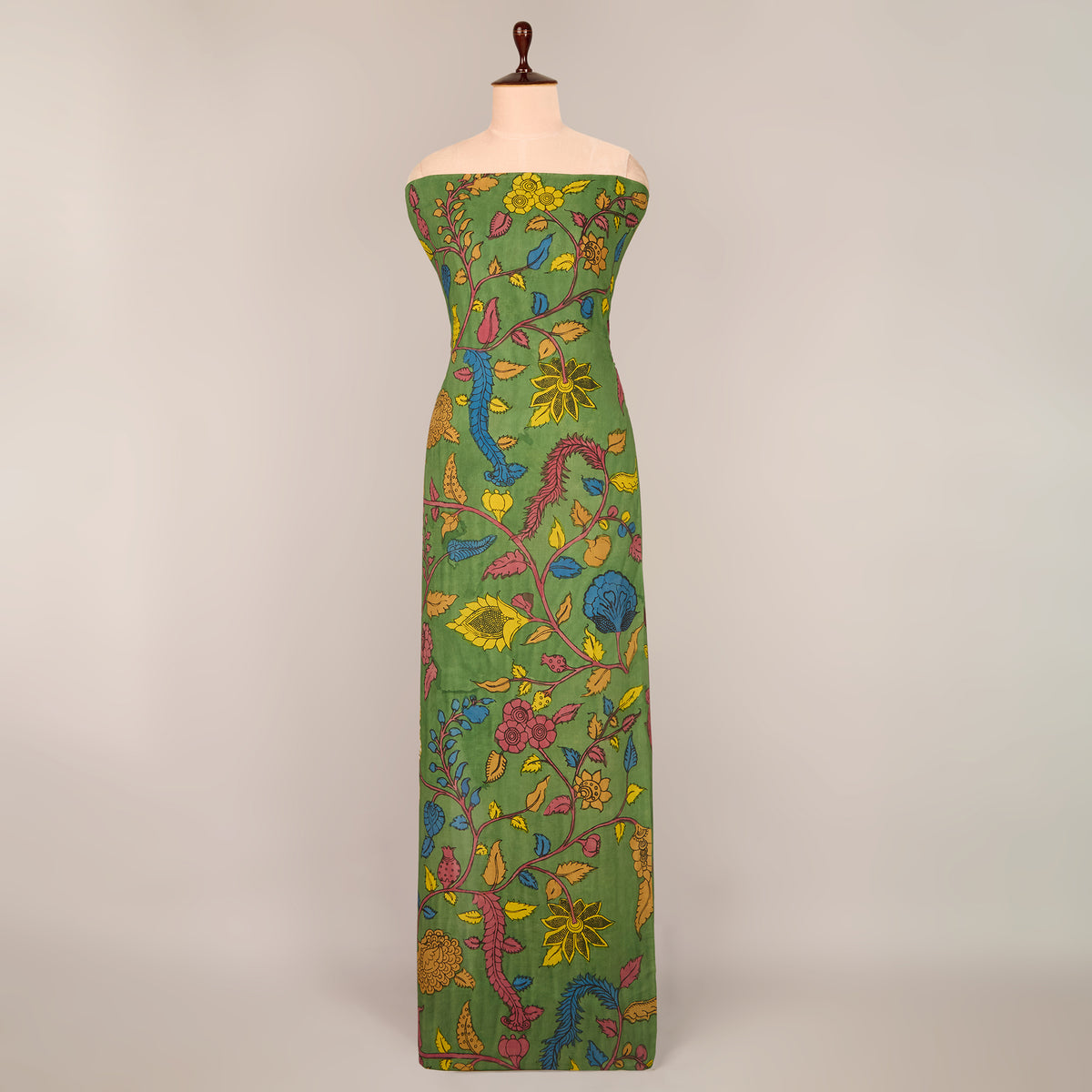 Explore the essence of craftsmanship with Vandana’s Green Assam Kalamkari Jaal Fabric. Perfect for all-season outfits and creative tailoring.