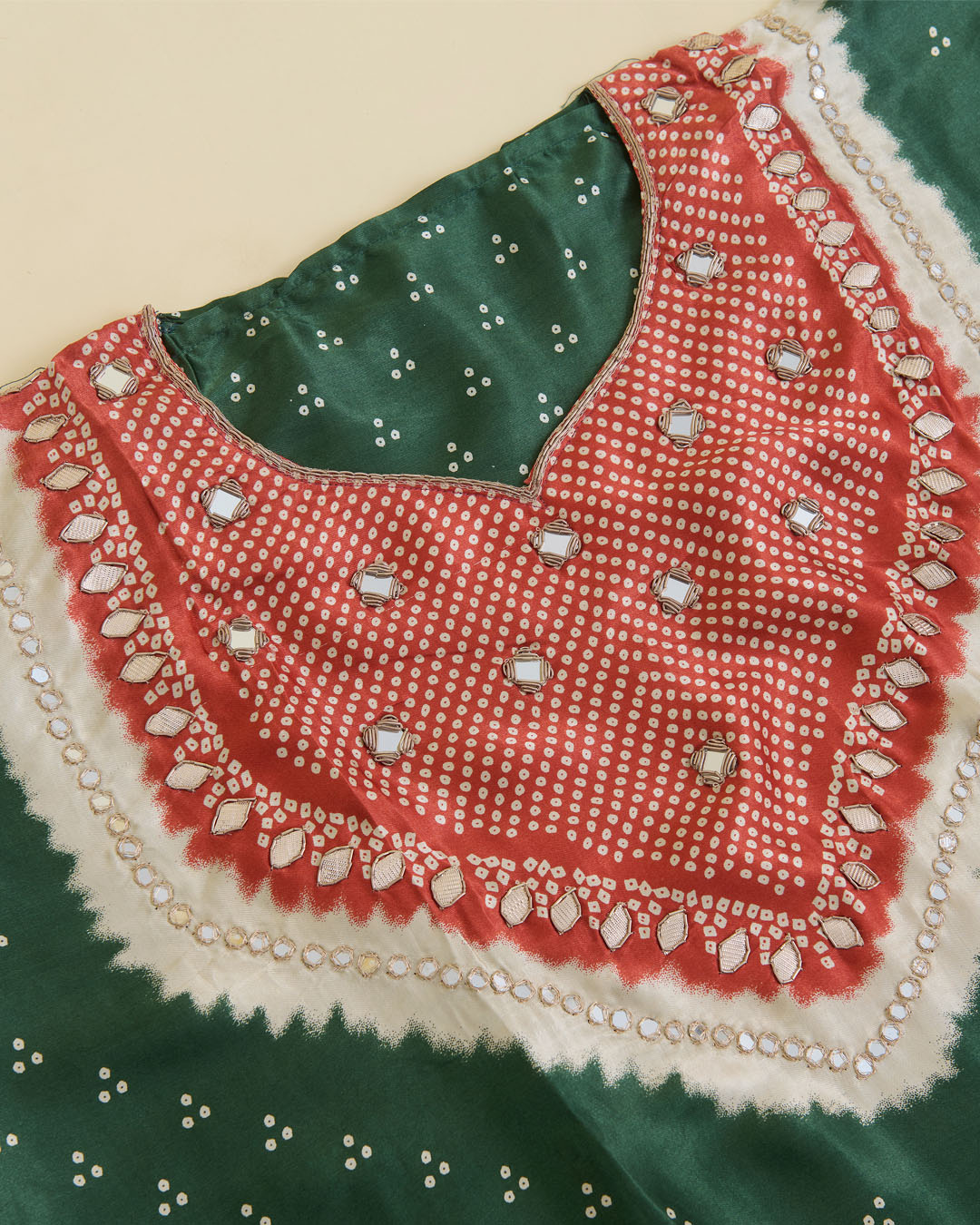 Elevate your festive wardrobe with this stunning Green Gajji Silk Bandhej Printed Suit, exquisitely detailed with mirror, gota, and zardozi embroidery on the neckline. The luxurious gajji silk enhances the traditional Bandhej aesthetic while ensuring a graceful drape. It is paired with a premium organza dupatta adorned with zari and sequence work, adding a refined festive shimmer. A plain shantoon bottom completes this elegant ensemble, perfect for weddings, cultural celebrations, and evening festivities.