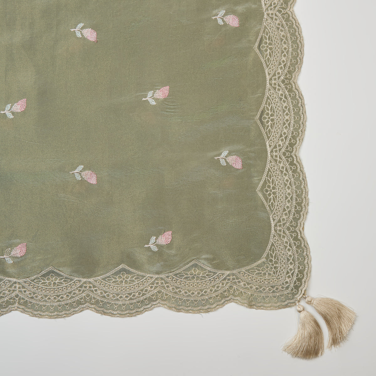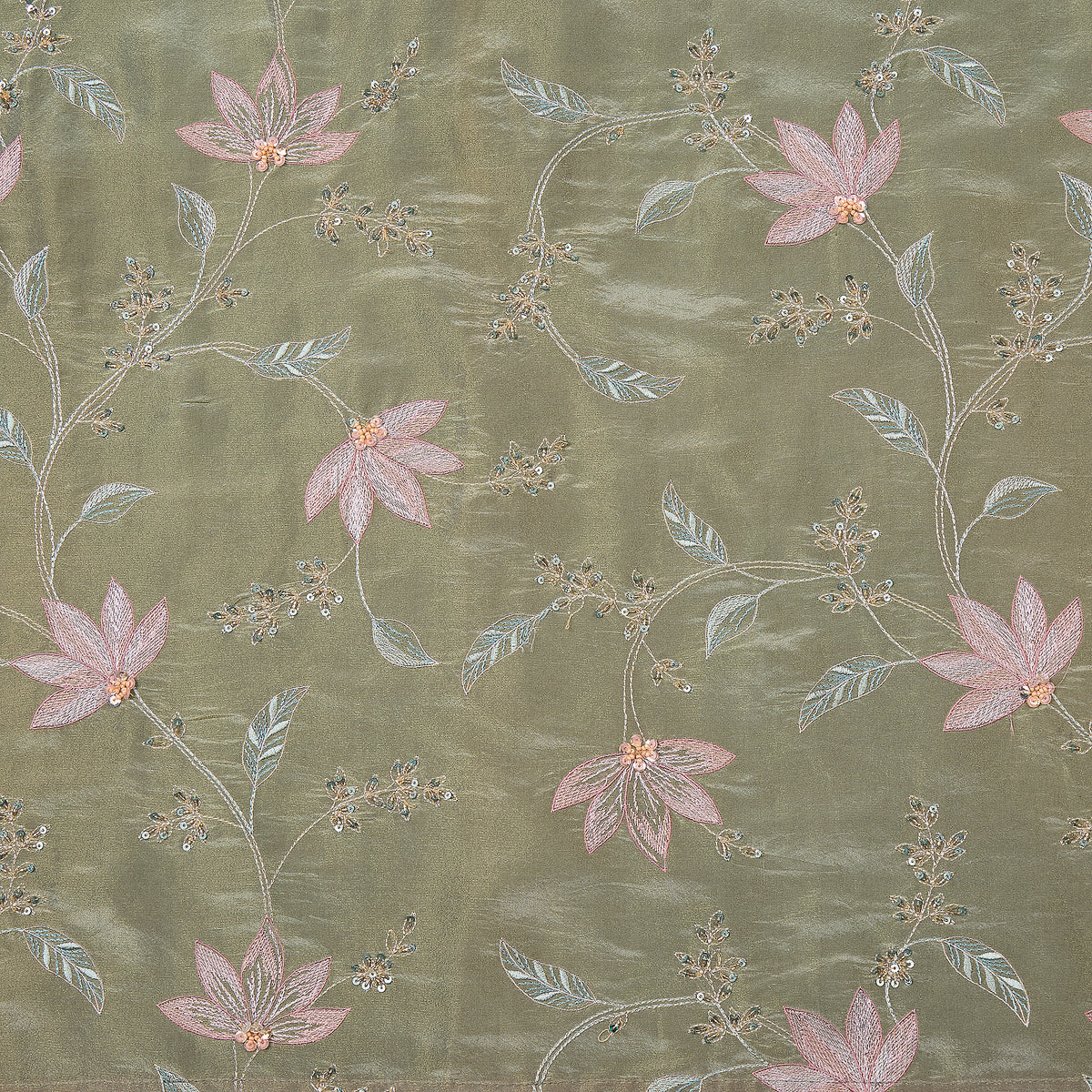 Dusty Green Color Tissue Kurta With All Over Resham Embroidery With Beeds,Seq,And Cutdana Highlight, Dupatta Also Same Fabric With Same Work And Plain Viscose Creape Bottom