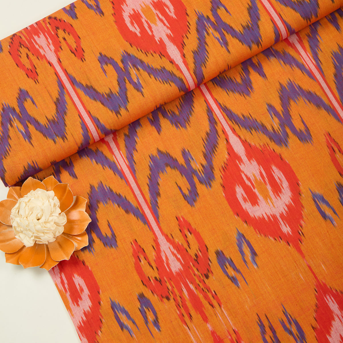 A bright orange shade with heavy ikat weaving, ideal for vibrant festive or contemporary wear.