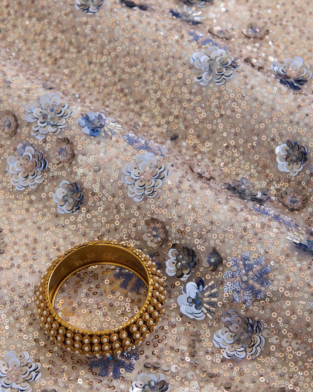 This lilac matt net sequins fabric by Vandana is beautifully enhanced with delicate 3D floral embroidery, creating a soft yet glamorous look. The subtle sheen of sequins paired with textured floral elements adds depth and elegance to the fabric.
