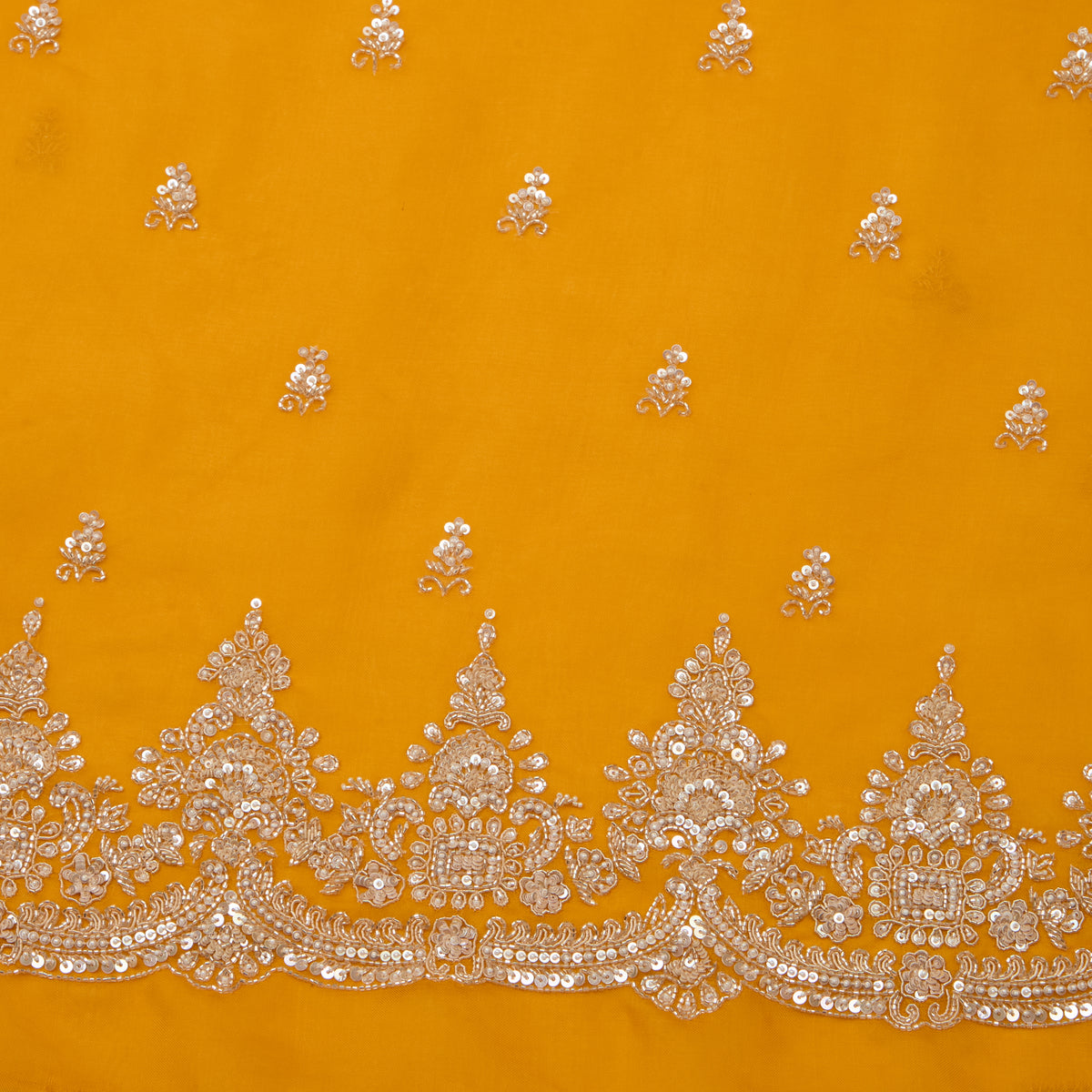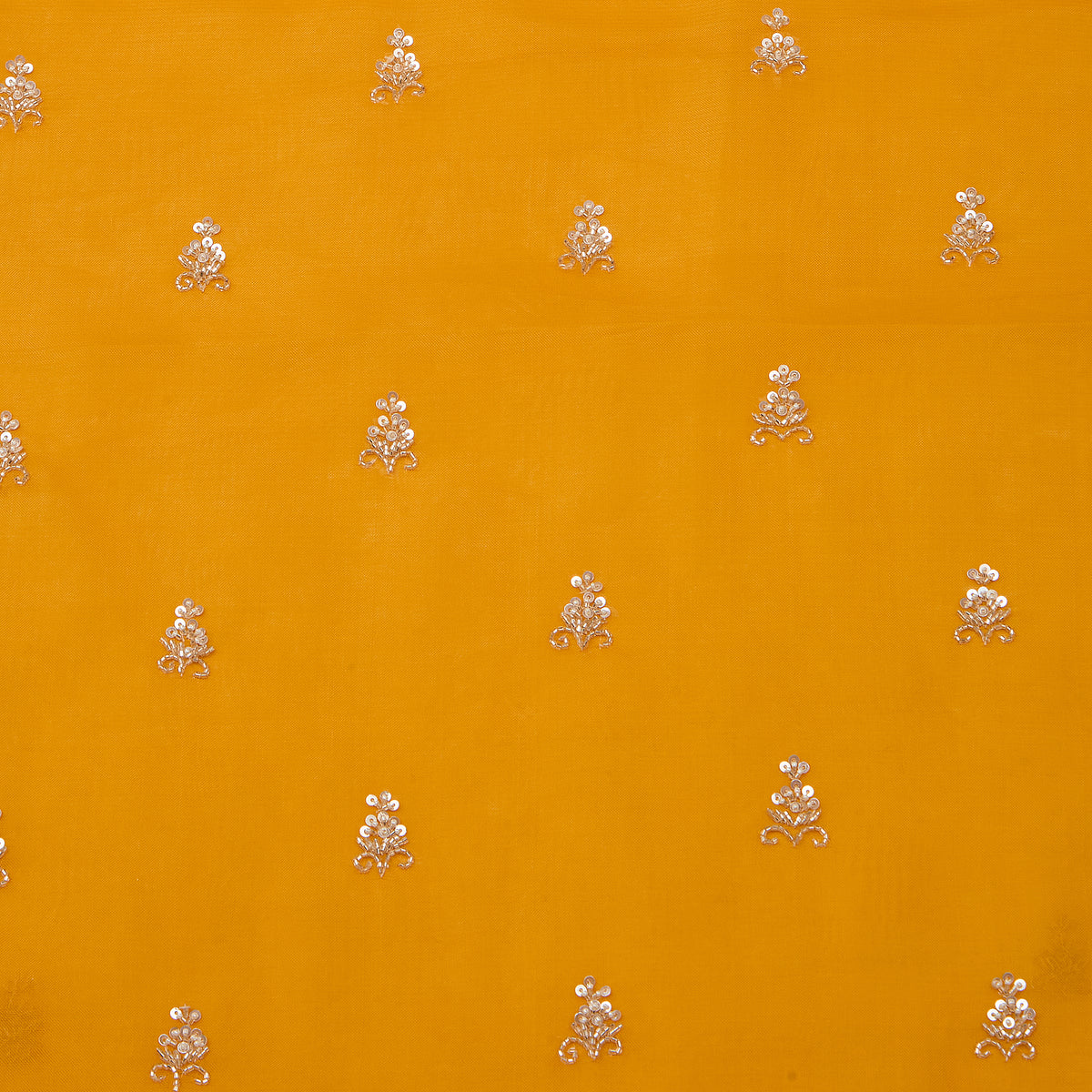 Mustard silk organza kurta set with intricate embroidery and matching dupatta. A stylish and sophisticated choice for festive looks.