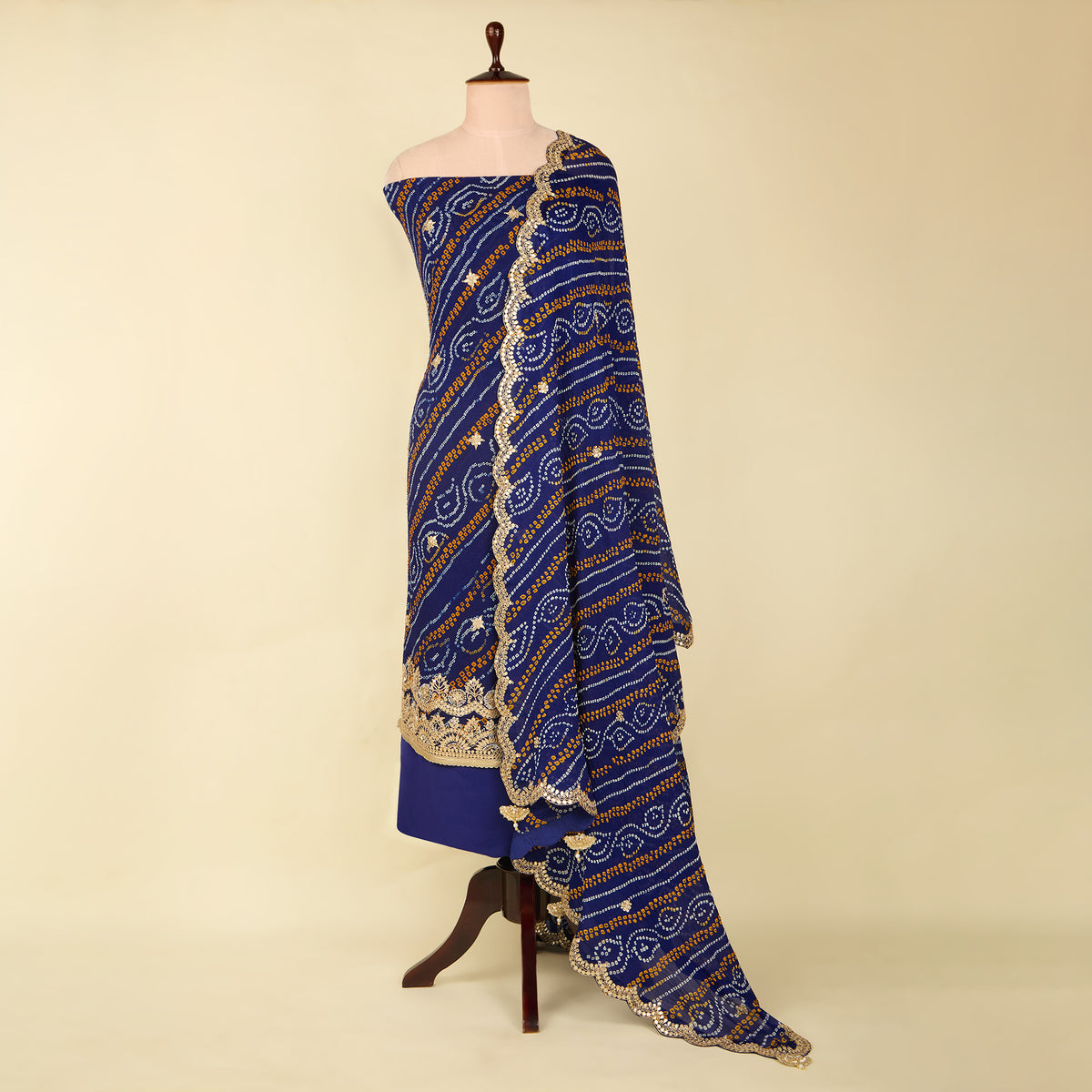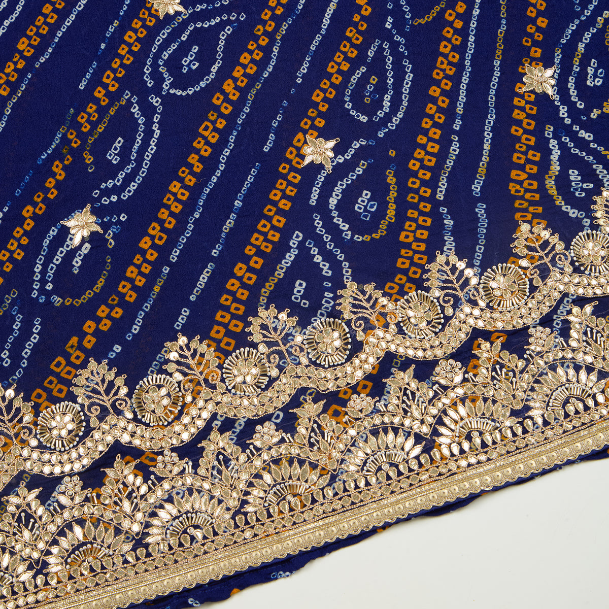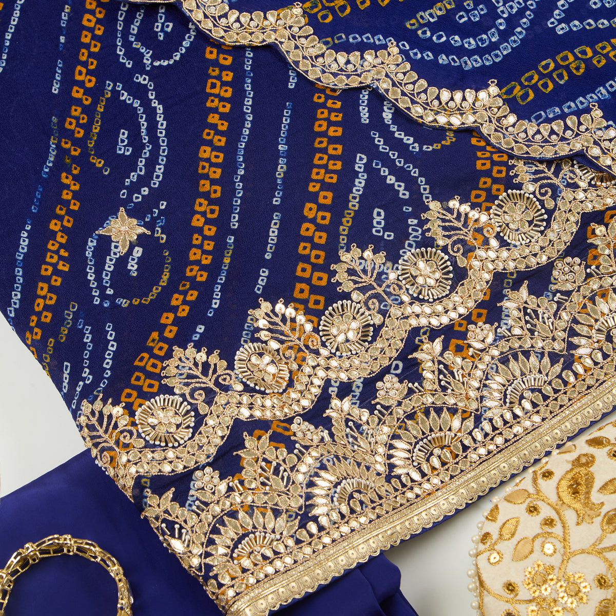 Make a regal statement with this Navy Blue Georgette Bandhani Suit, featuring exquisite Gota, Dori, and Pearl Embroidery on the daman and buti. Paired with a matching Georgette Bandhani Dupatta, this ensemble exudes traditional elegance blended with modern grace.