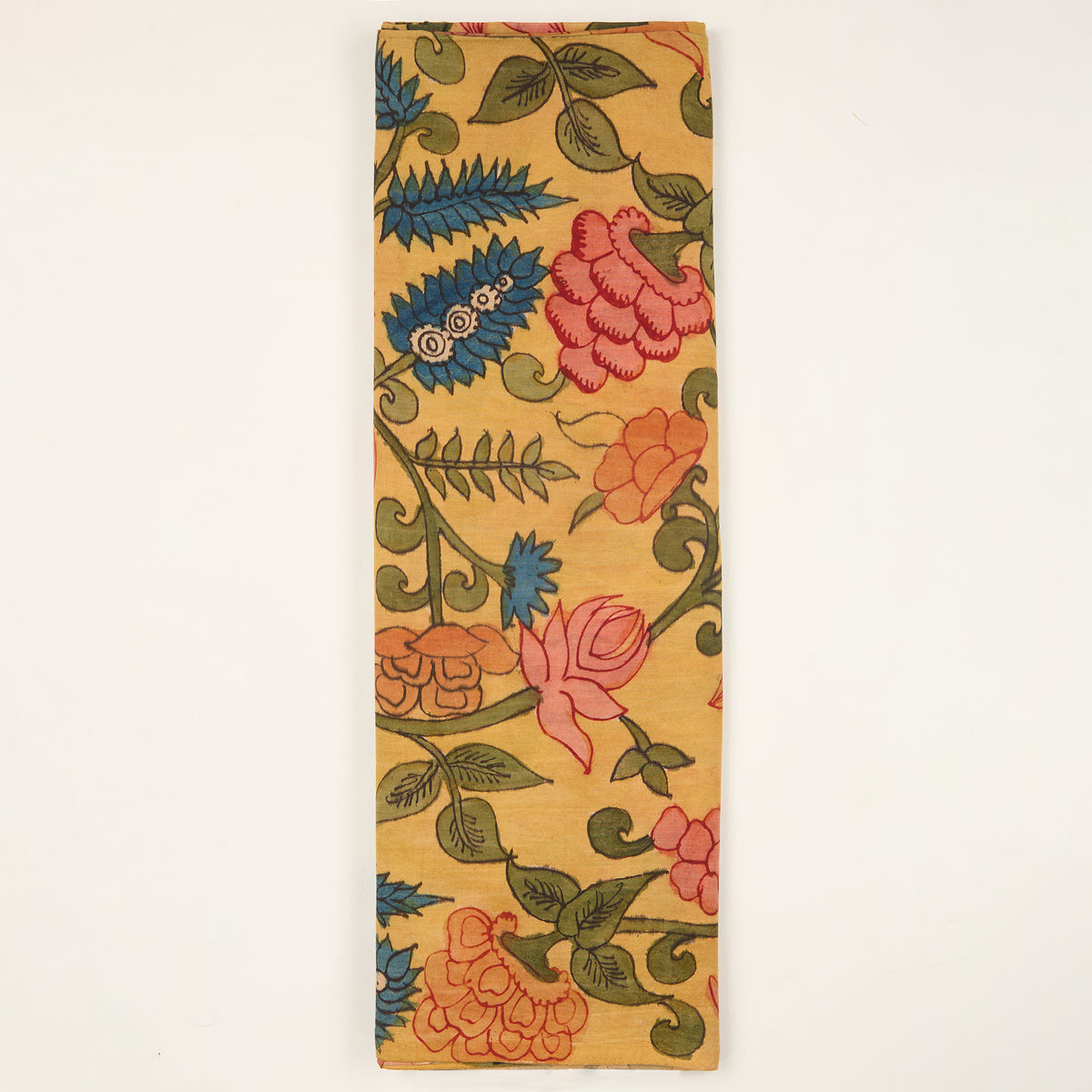 Explore the essence of craftsmanship with Vandana’s Ochre Yellow Assam Kalamkari Jaal Fabric. Ideal for ethnic wear, dresses, and home décor.