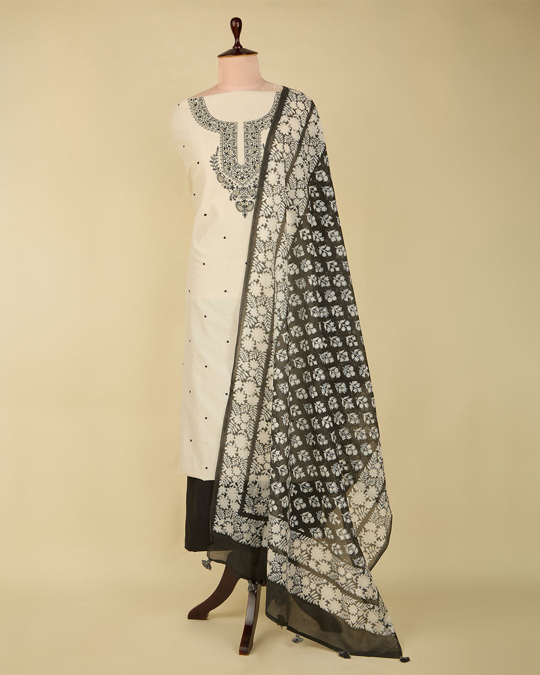 Add a timeless touch to your ethnic collection with this elegant Off-White and Black Maheshwari suit set. The kurta features intricate resham and zari embroidery on the neckline with delicate butti work scattered all over. It is paired with a beautifully printed Chanderi dupatta and a solid black cotton bottom for a graceful, balanced look.