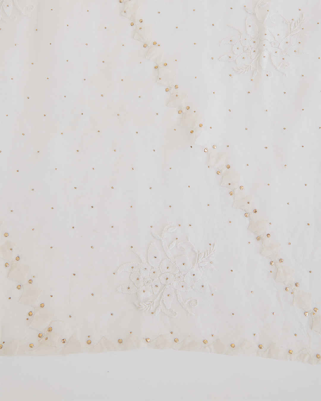 This off-white organza dupatta features delicate Lucknowi thread embroidery highlighted with classic lehriya patterns and subtle badla work. The sheer organza base adds an airy elegance, making it a refined choice for festive and traditional ensembles.