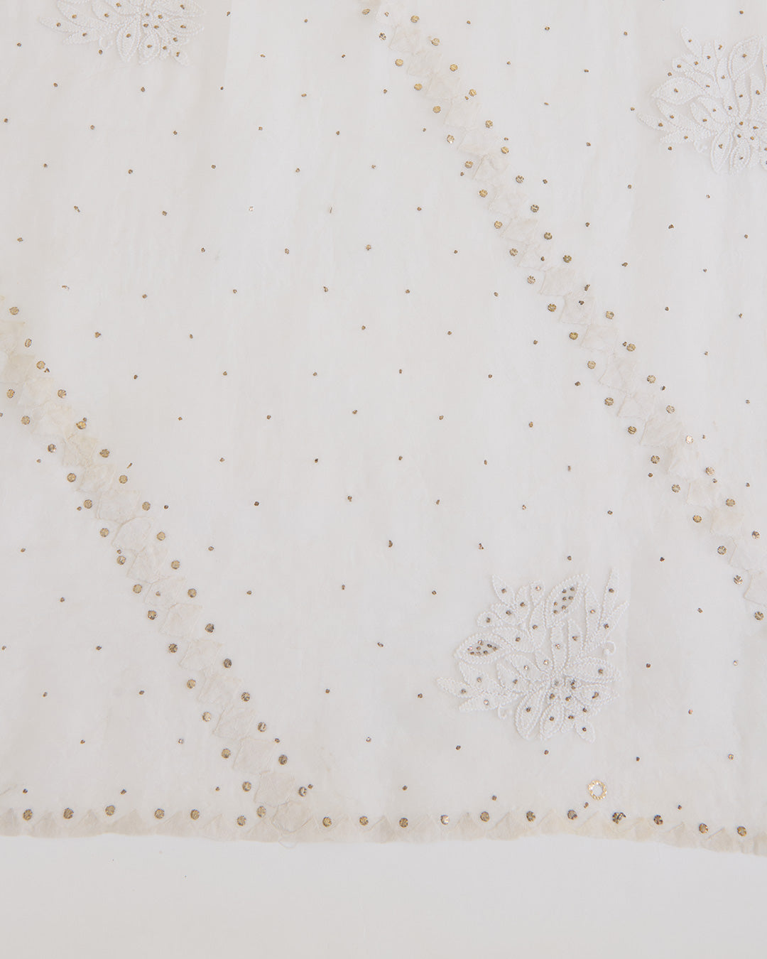 This offwhite organza dupatta showcases elegant Lucknowi thread embroidery combined with a graceful lehriya pattern, enhanced by subtle badla work. The sheer texture of organza adds a refined and airy feel, making it a timeless ethnic accessory.