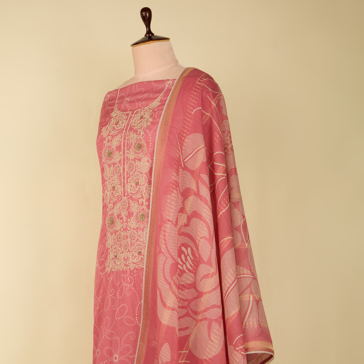 Gracefully crafted in Onion Pink Chanderi, this printed suit features detailed zardosi, dori, and sequin embroidery on the neck, paired with a woven printed dupatta for an elegant festive look.