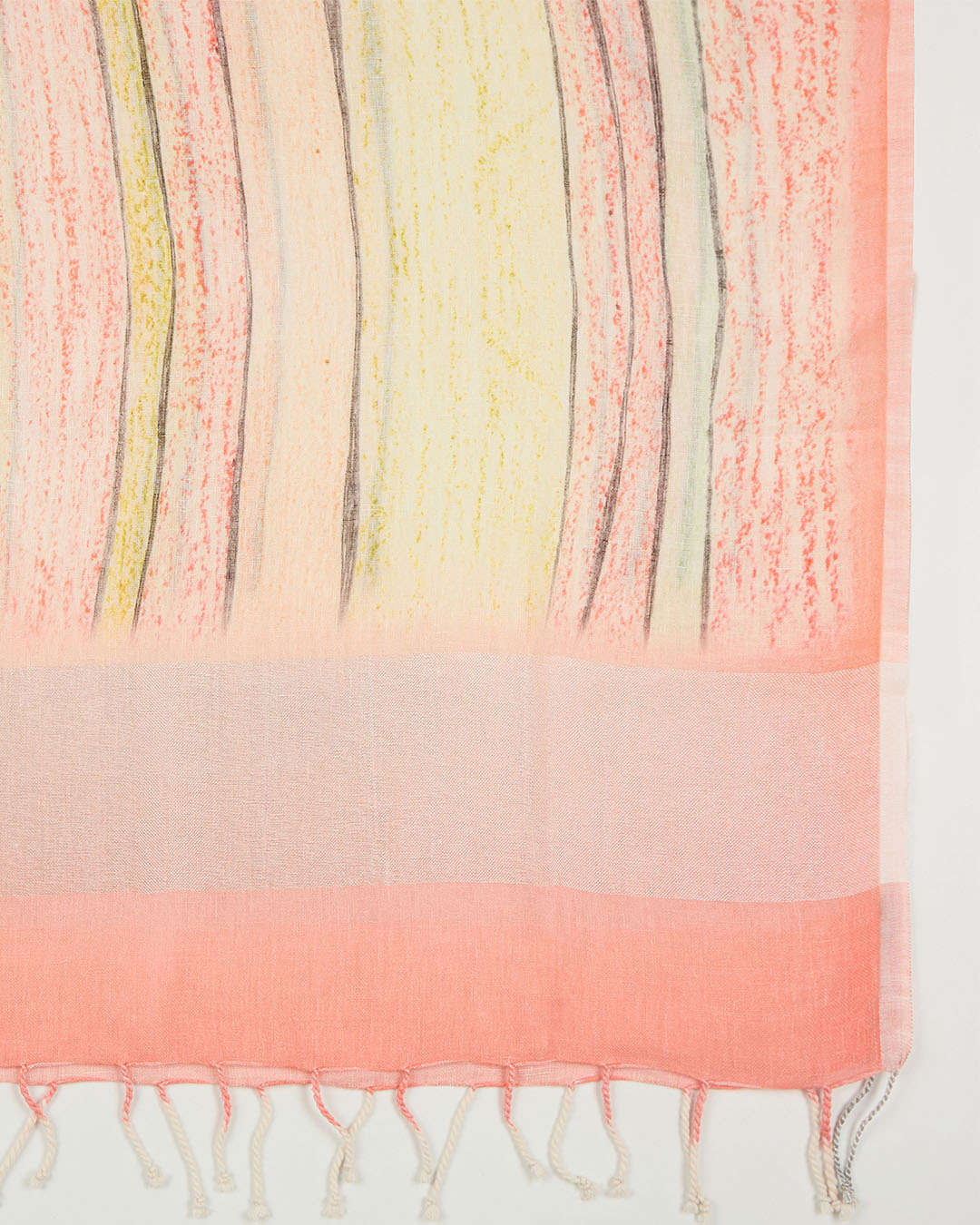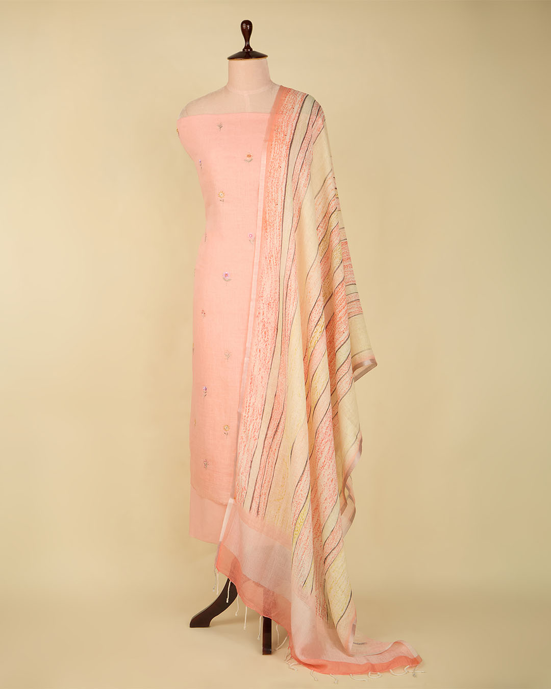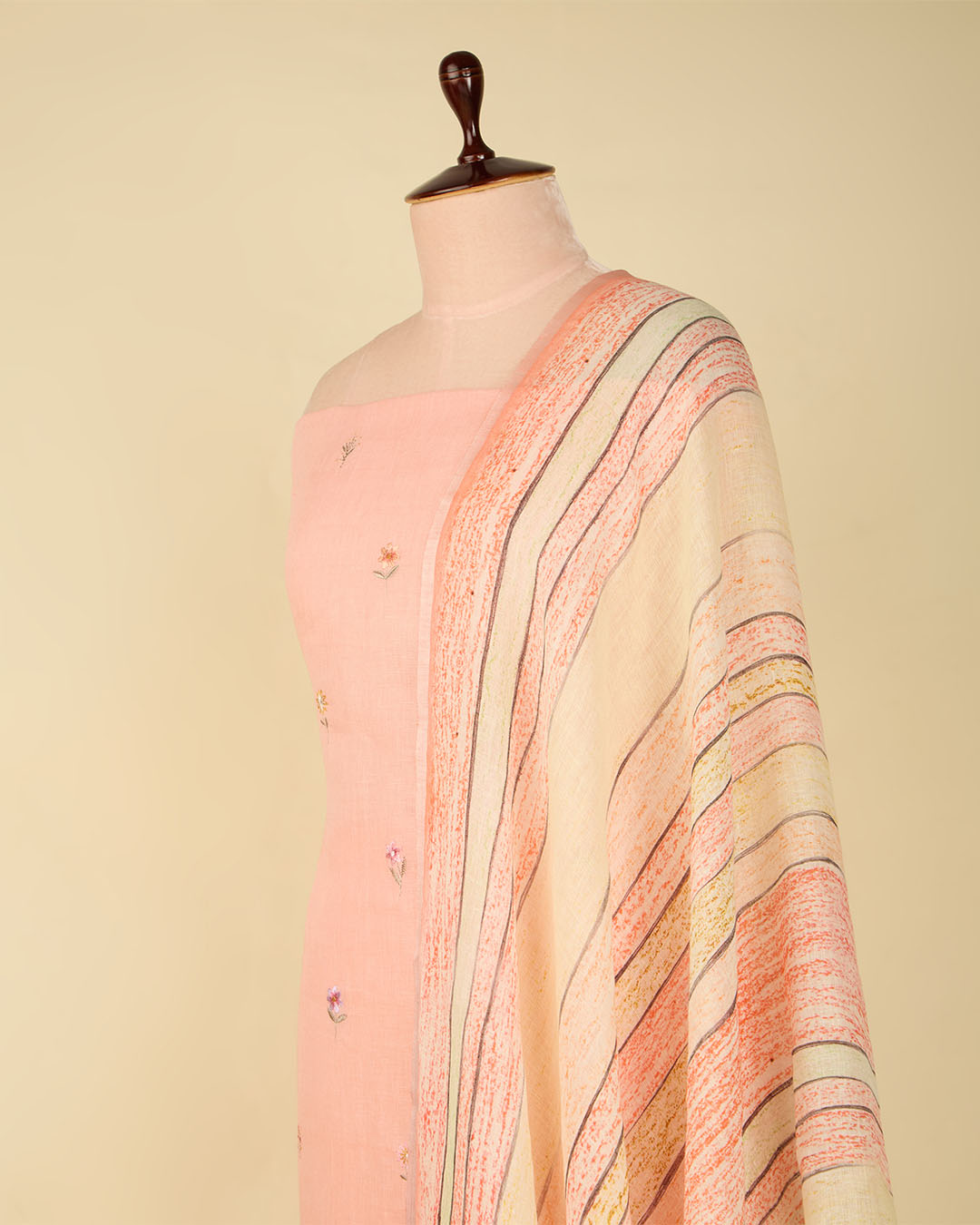Elegant and breathable, this peach linen suit set brings together delicate embroidery and artistic flair. The kurta features all-over Resham embroidered butti for a refined finish, while the digitally printed linen dupatta adds a touch of modern vibrancy. Paired with a plain cotton bottom, this suit is ideal for brunches, casual gatherings, or light festive occasions.