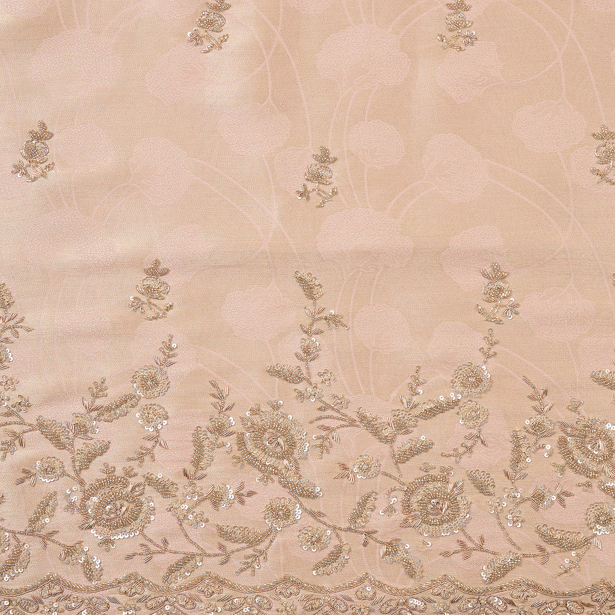 Peach Color Tissue Woven Kurta With Sequins, Cutdana And Pearl Work In Daman And All Over Butti, Dupatta Same Fabric Four Color Shaded With Same Work And Plain Viscose Crepe Bottom