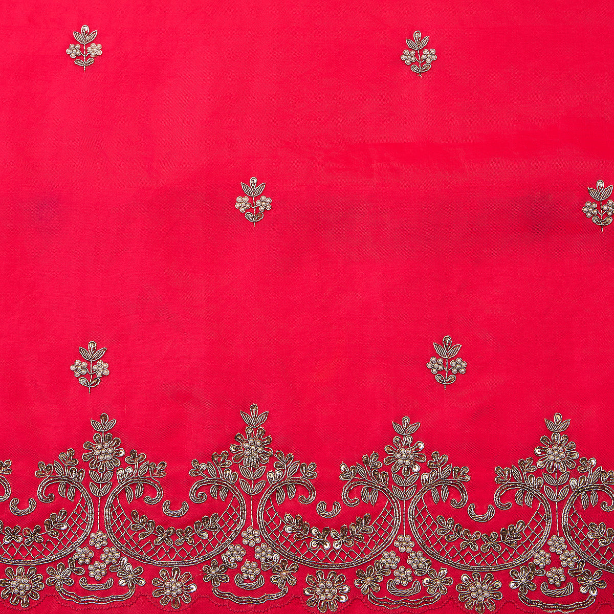 Rani pink silk organza kurta adorned with exquisite zardozi, sequin, and pearl embroidery on the daman and scattered butti. Paired with a matching dupatta in the same fabric featuring coordinated embroidery and a plain viscose crepe bottom.