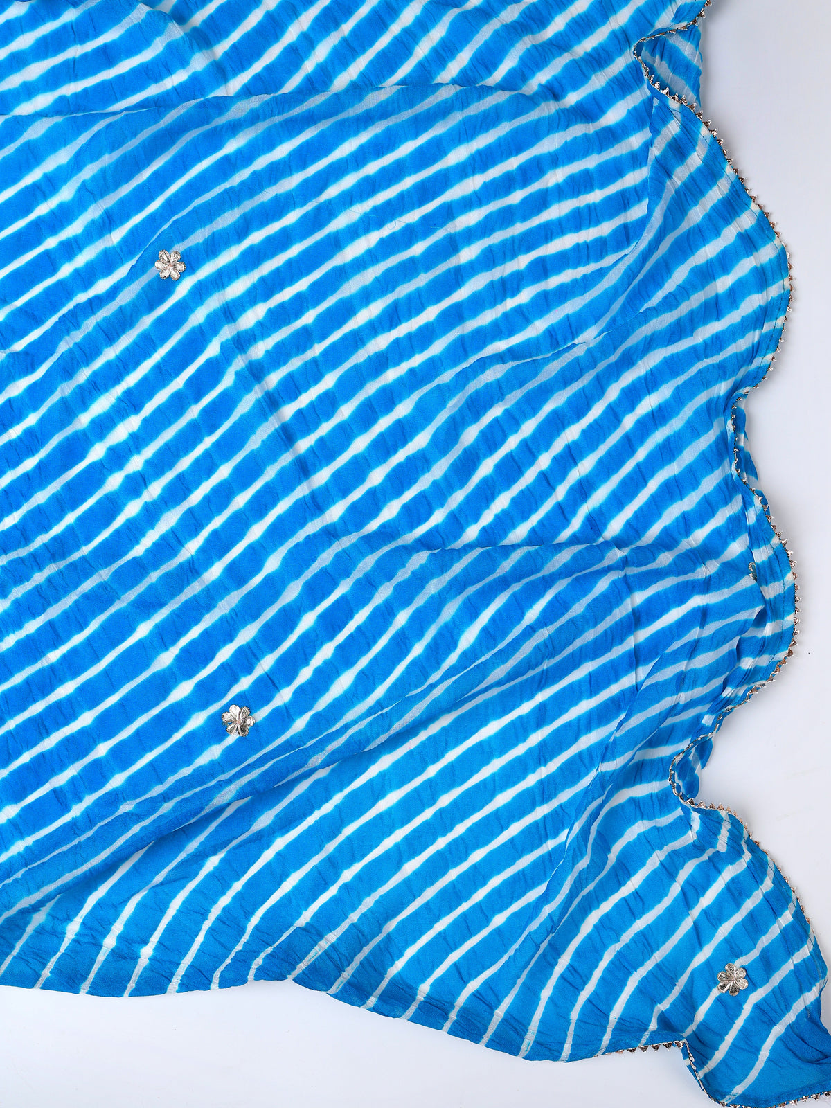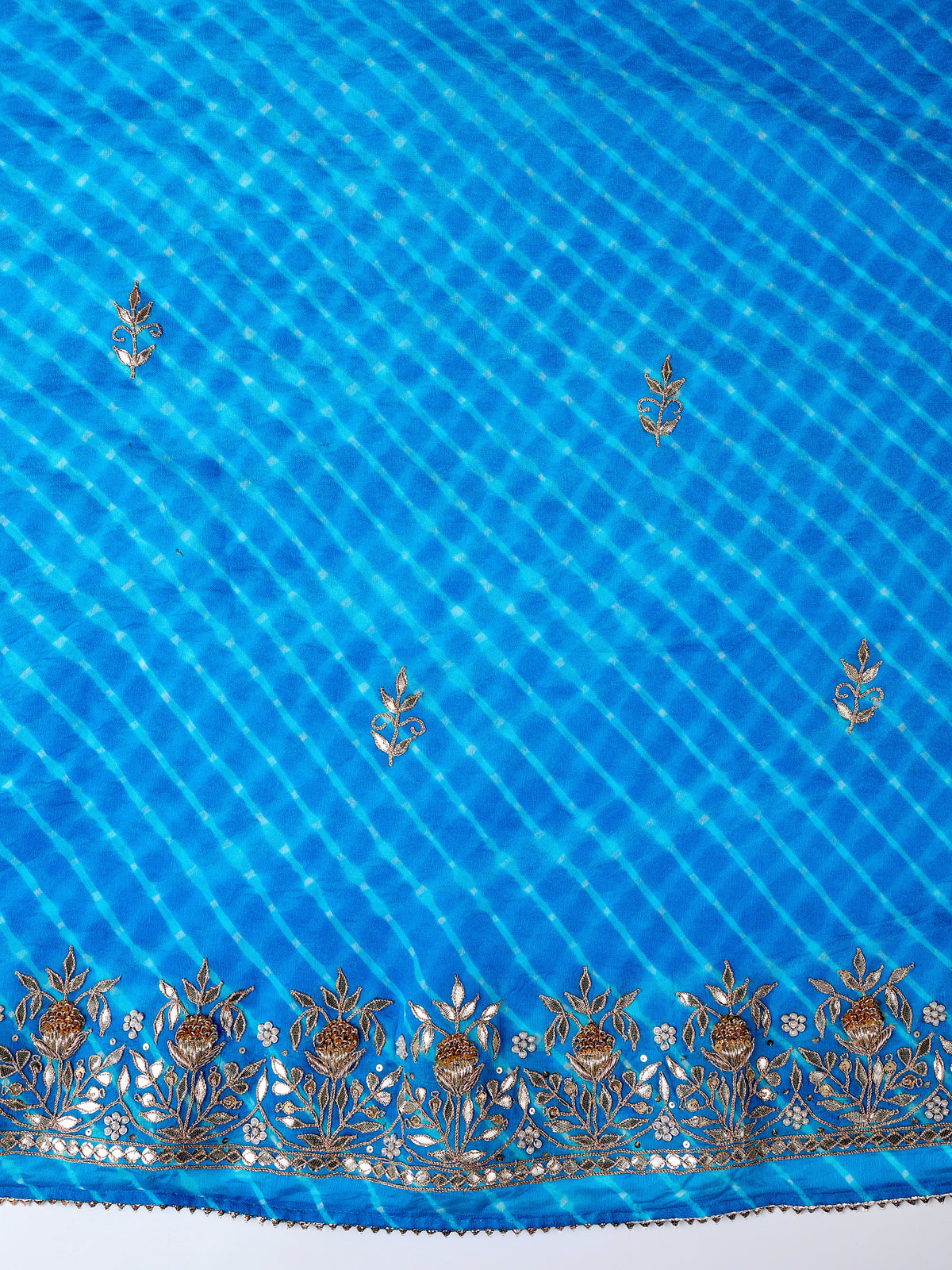 Vibrant teal blue pure georgette leheriya kurta with rich gota, sequin, dori, and pearl work on the daman and all-over butti. Coordinated dupatta and plain georgette bottom complete the ensemble.