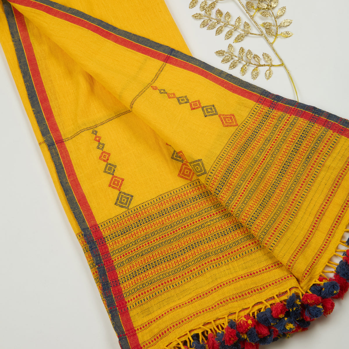 Embrace the beauty of sustainable craftsmanship with this Yellow Kala Cotton Handwoven Dupatta. Woven by skilled artisans using eco-friendly Kala cotton, this piece reflects authenticity and traditional weaving heritage.